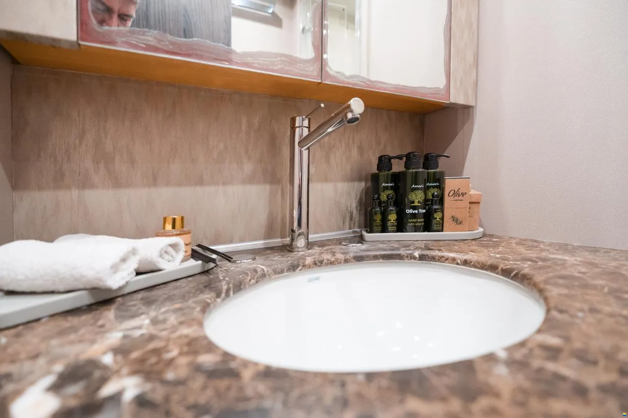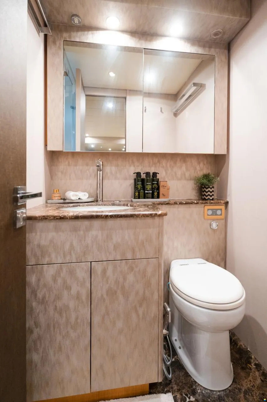 * Master Cabin: full-beam, large double bed (1.5 × 2.0 m), sofa, ensuite bathroom