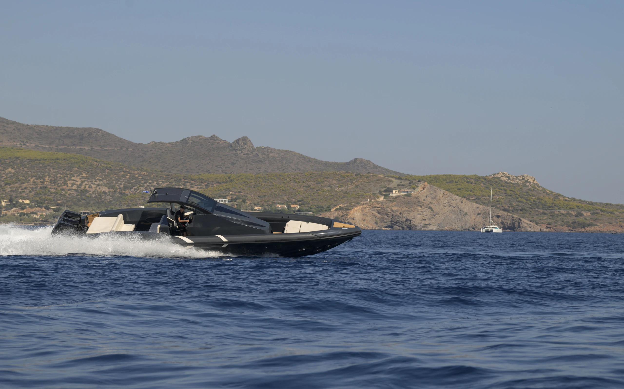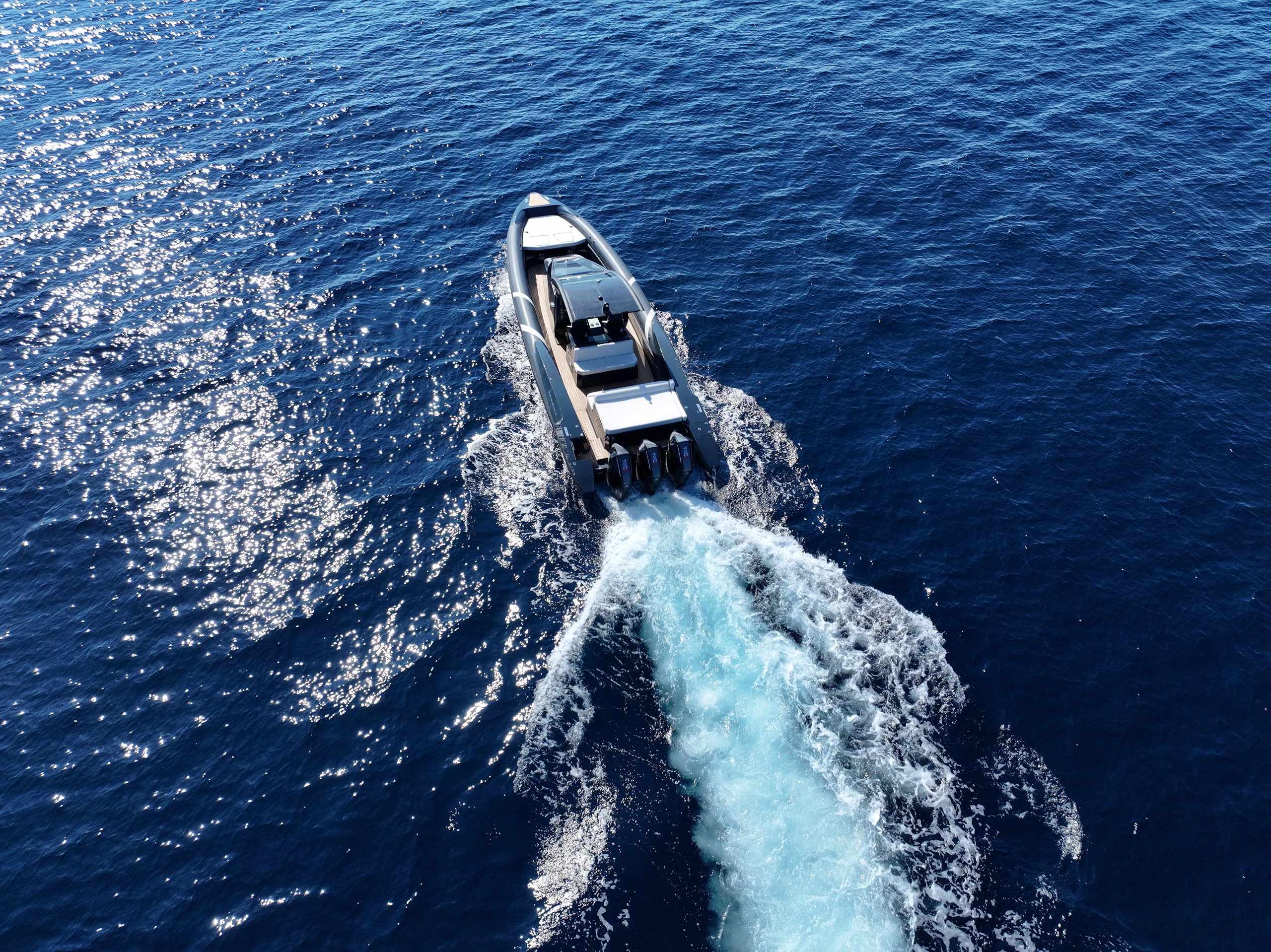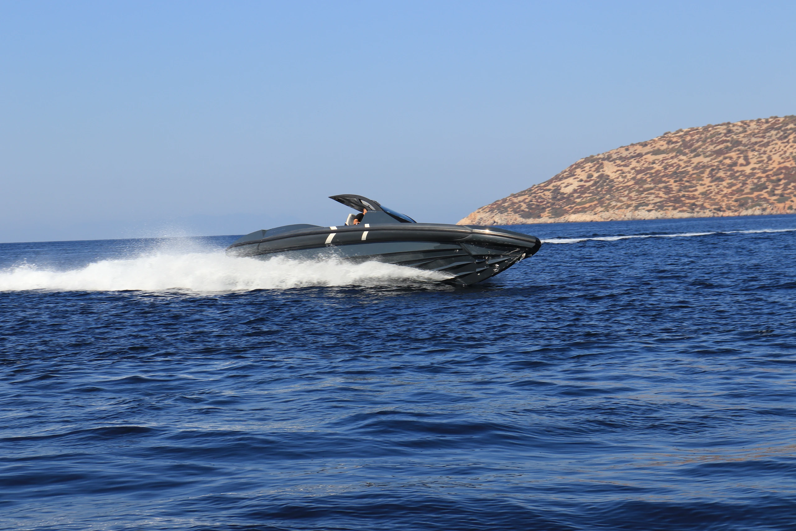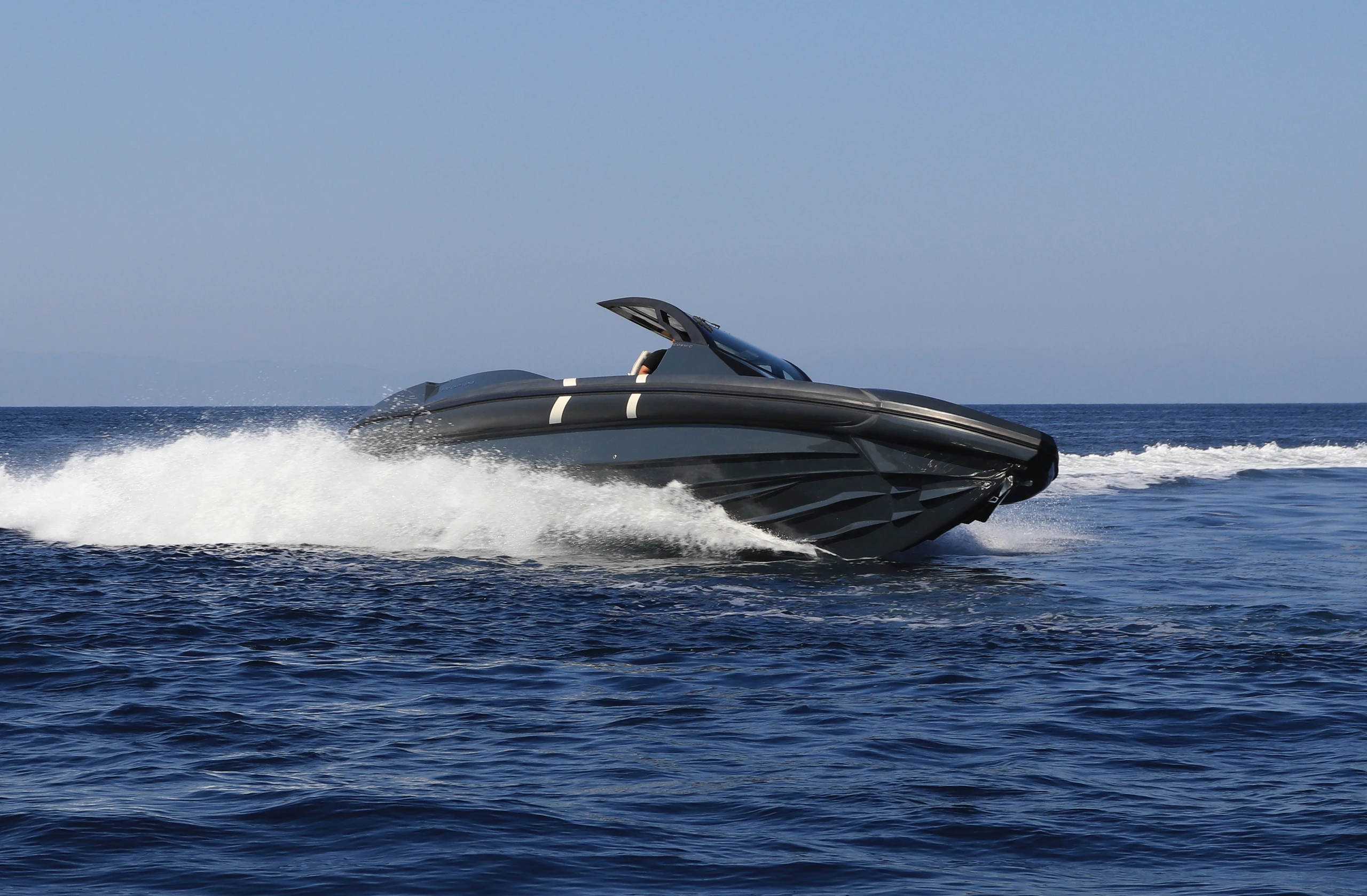 Thanks to the advanced hull design with the unique Double Chine Effect, 3 Ventilated Steps, and Anti-Dive System, the boat ensures an extremely smooth ride and impressive fuel economy even in difficult conditions. It has been tested in seas up to 6 Beaufort scale, maintaining absolute comfort, and can easily cope with more demanding conditions (up to 7 Beaufort scale). Its greatest advantage is its unsurpassed stability in rough seas, always offering safety and high performance.